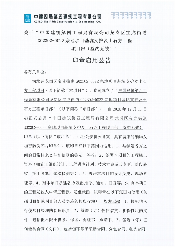 关于“中国建筑第四工程局有限公司龙岗区宝龙街道G02302-0022宗地项目基坑支护及土石方工程印章启用公告